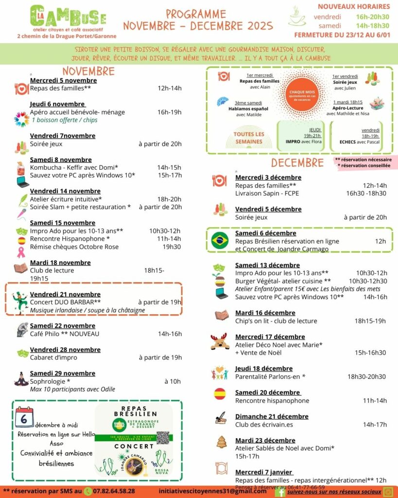 Et toujours : le repas des familles le 1er mercredi de chaque mois sur réservation, les rencontres hispanophones conviviales, familiales et chaleureuses, anniversaire sur mesure, échecs, impro, Club de lecture, kombucha…